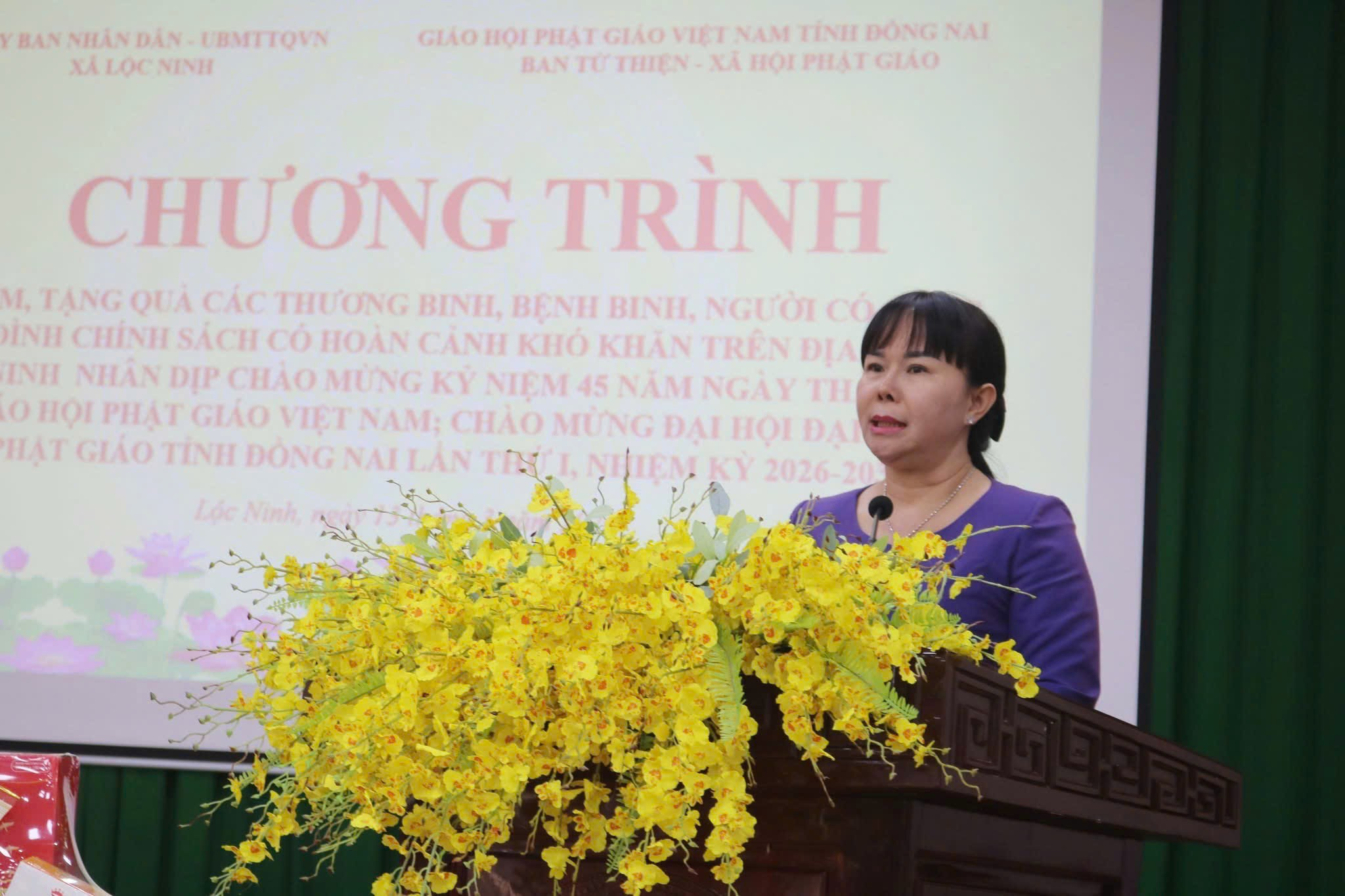 Ni sư Như Hiền phát biểu trong buổi tặng quà tại xã Lộc Ninh