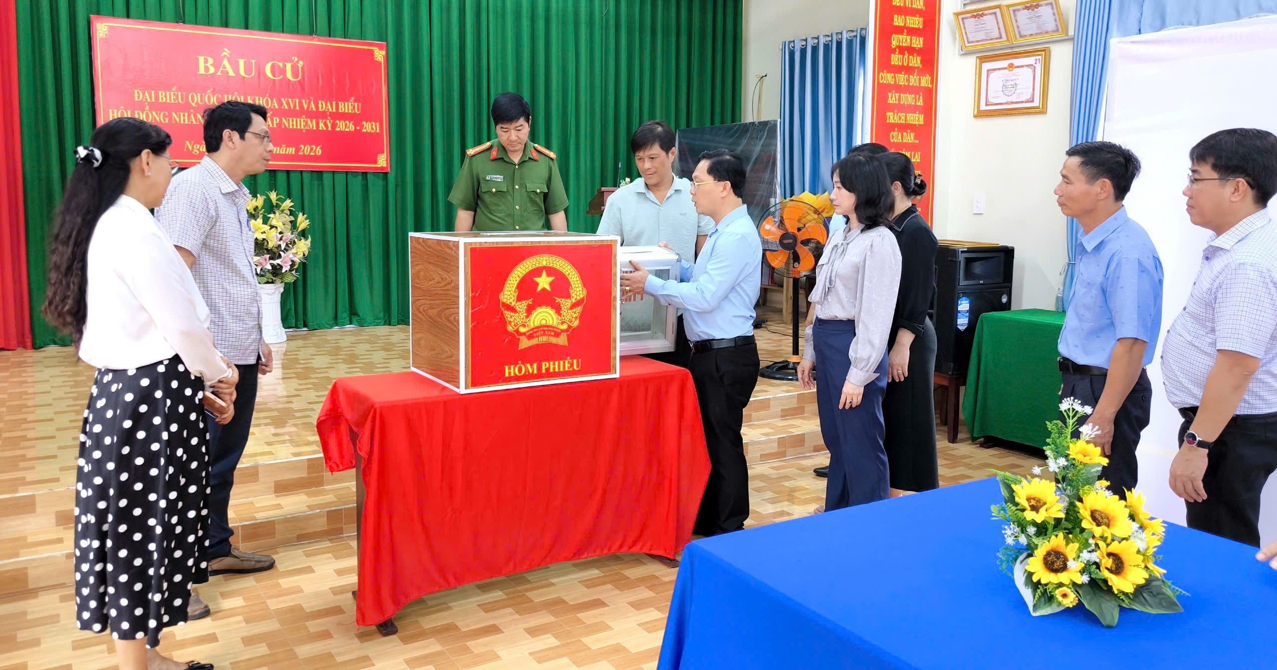 Ủy viên Ban Thường vụ Tỉnh ủy, Phó chủ tịch Thường trực UBMTTQVN tỉnh, Hà Anh Dũng trưởng đoàn kiểm tra số 6 của UBBC tỉnh (đứng bên phải thùng phiếu) cùng Đoàn công tác đang kiểm tra công tác chuẩn bị bầu cử của xã Thuận Lợi.