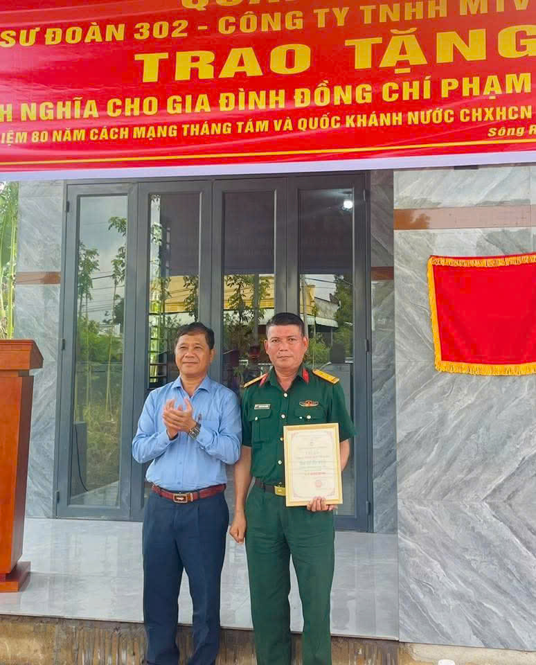 Lãnh đạo Đảng Ủy xã Sông Ray và lãnh đạo sư đoàn 302 trao quyết định tặng nhà cho gia đình đồng chí Phạm Quốc Dương