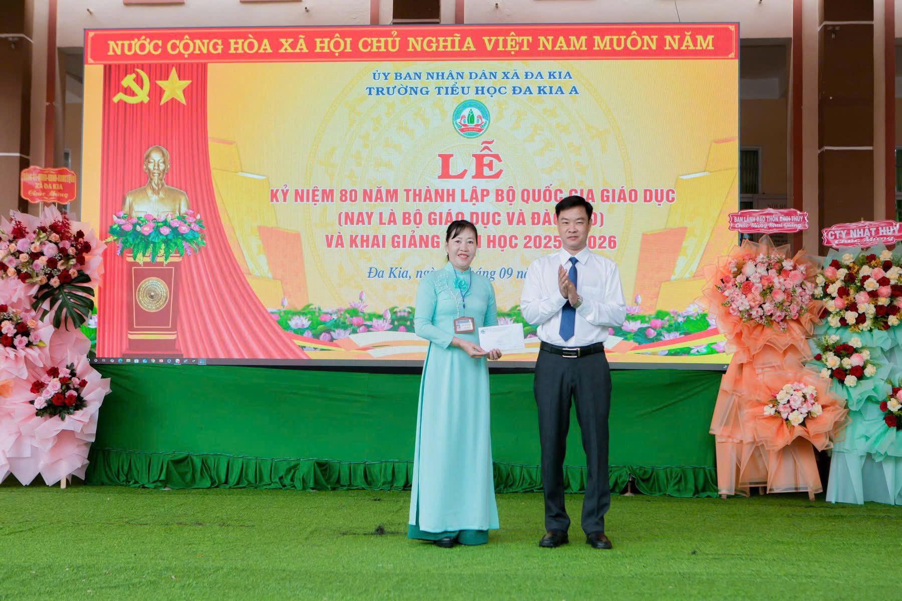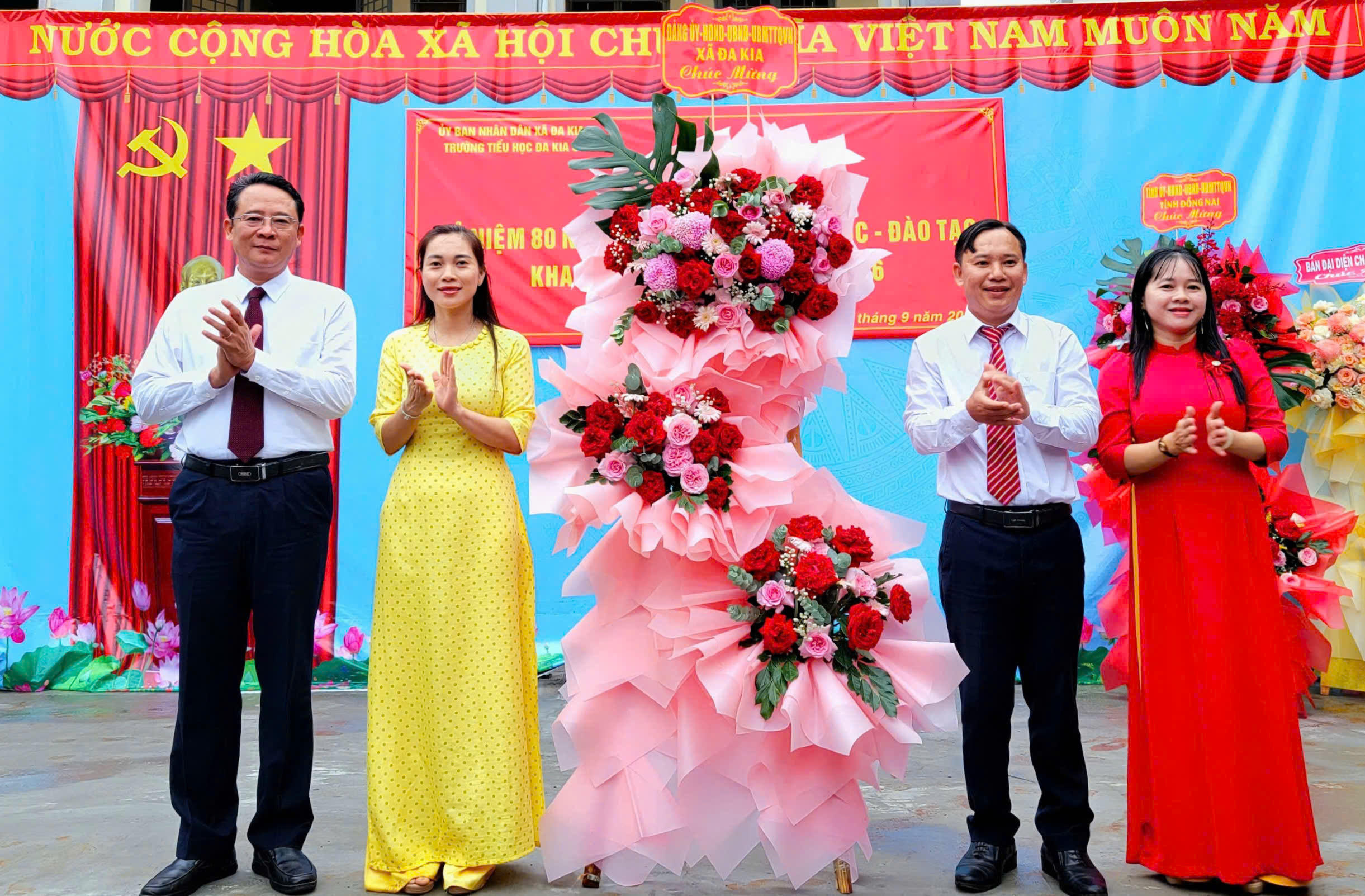 Đồng chí Lý Trọng Nhân - TUV - Bí thư Đảng uỷ - Chủ tịch HĐND xã, bà Phùng Thị Kim Yến - ĐUV - PCT UBMTTQVN xã, Chủ tịch Hội LHPN xã trao tặng hoa cho lãnh đạo trường Tiểu học Đa Kia C