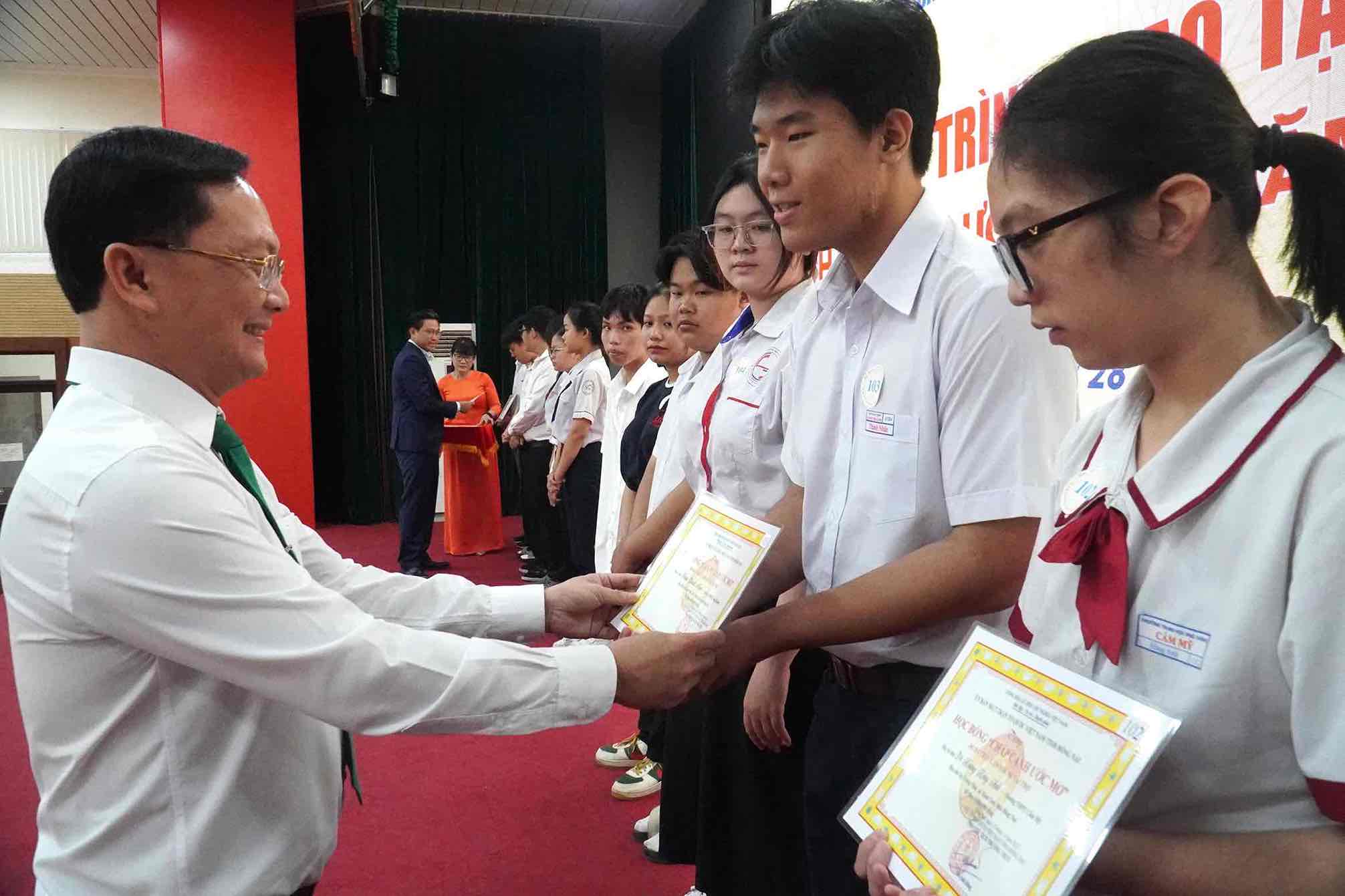 Phó Chủ tịch Ủy ban MTTQ Việt Nam tỉnh - Nguyễn Tân Phú cùng Giám đốc hành chính Công ty Cổ phần Đầu tư và Kinh doanh Gold Long Thành - Lại Thế Đồng đại diện nhà tài trợ Quỹ học bổng “chắp cánh ước mơ” trao học bổng cho học sinh, sinh viên