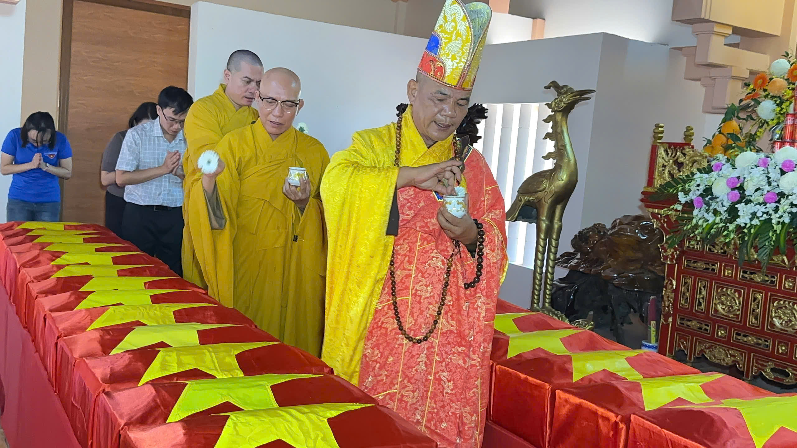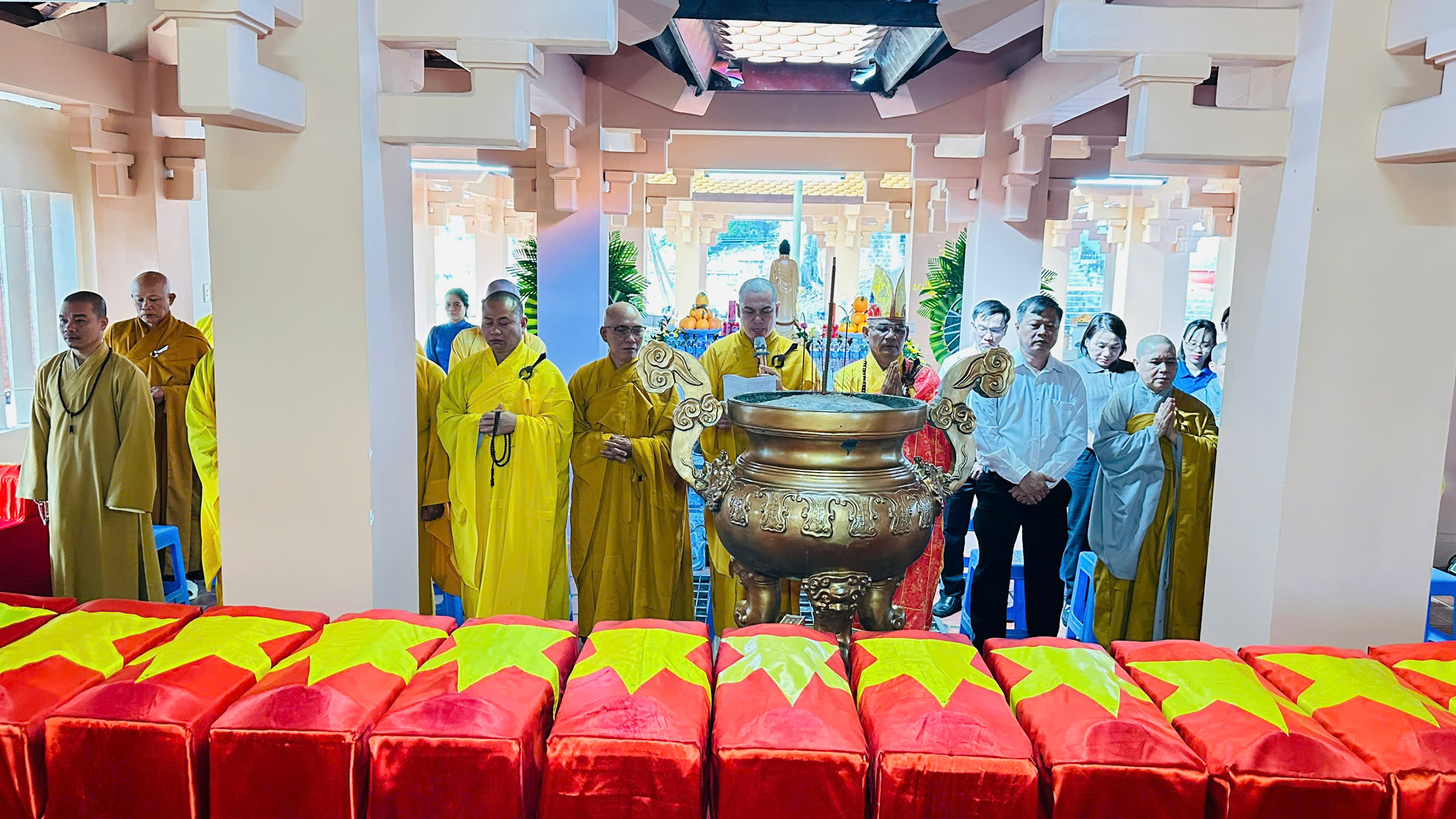 Nén tâm nhang giữa lòng đại đoàn kết Buổi lễ không chỉ là nghi thức tôn giáo mà còn là biểu tượng rực rỡ của tinh thần đại đoàn kết toàn dân tộc. Sự phối hợp chặt chẽ giữa cơ quan quân sự (Bộ CHQS tỉnh), cơ quan quản lý nhà nước (Sở Nội vụ), tổ chức chính trị - xã hội nòng cốt (Mặt trận Tổ quốc) và tổ chức tôn giáo (Giáo hội Phật giáo Việt Nam tỉnh) đã tạo nên một không gian tưởng niệm vừa trang trọng, vừa ấm áp tình quân dân. Tiếng chuông bát nhã vang lên giữa khói trầm nghi ngút, xóa nhòa khoảng cách giữa người ở lại và người đã khuất. Những người lính năm xưa nay trở về trong hình hài của đất đai, cây cỏ, được Nhân dân và đồng đội đón chào bằng tất cả lòng thành kính. Lời hứa của người đang sống Việc tổ chức Lễ cầu siêu không chỉ để an ủi vong linh người đã khuất mà còn là bài học lịch sử sống động, giáo dục thế hệ trẻ về giá trị của hòa bình và sự hy sinh. 41 người con ưu tú ấy đã hoàn thành sứ mệnh với Tổ quốc, và hôm nay, Tổ quốc giang rộng vòng tay đón các anh về. Lễ cầu siêu khép lại, nhưng ngọn lửa tri ân vẫn cháy mãi. Các anh đã về lại với Đất Mẹ yêu thương, trong sự chở che của Phật pháp và lòng biết ơn vô hạn của Nhân dân tỉnh nhà. Một số hình ảnh tại Buổi cầu siêu: