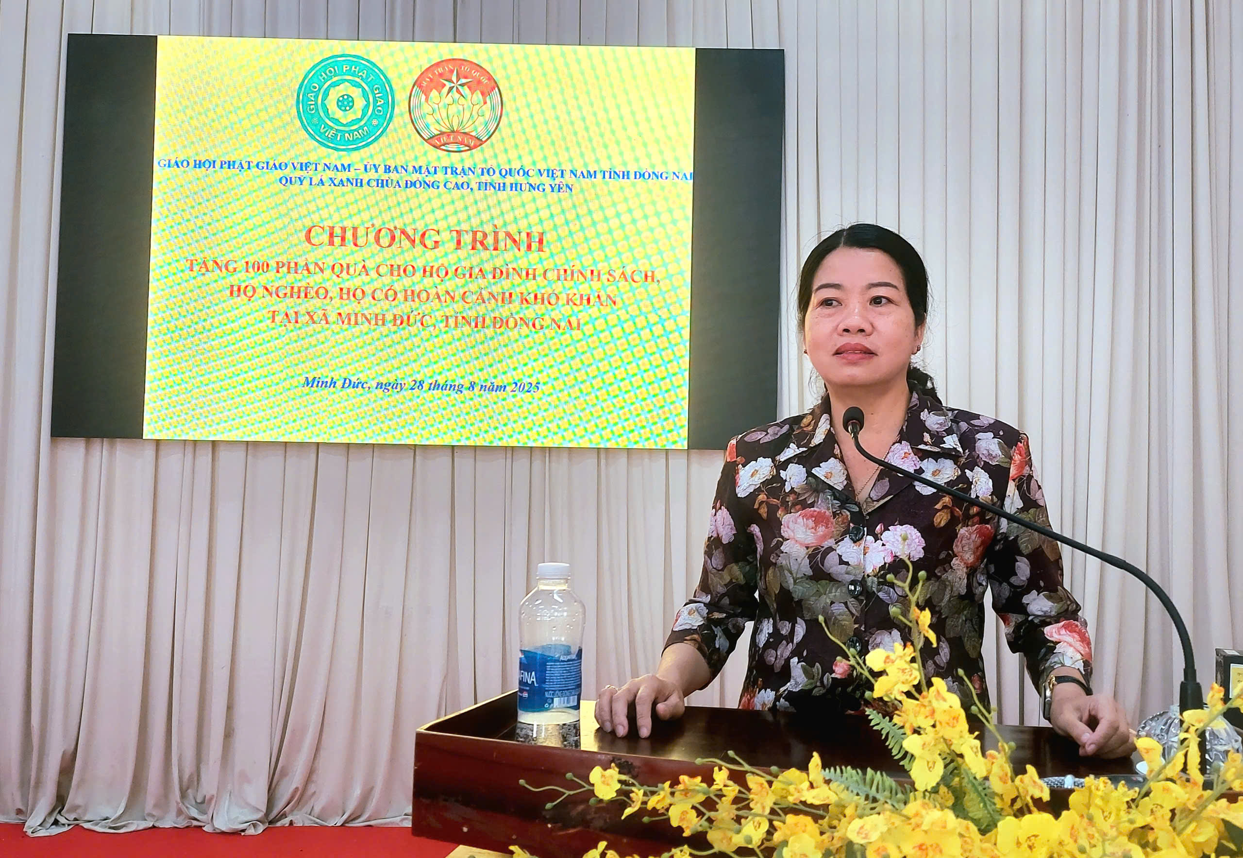 Chương trình trao tặng 1.000 phần quà, do Quỹ Lá Xanh chùa Đống Cao (tỉnh Hưng Yên) tài trợ với tổng giá trị 1,5 tỷ đồng, đã được tổ chức chu đáo, trang trọng và ấm áp tại 10 xã: Tân Hưng, Minh Đức, Lộc Thành, Lộc Tấn, Lộc Thạnh, Tân Tiến, Hưng Phước, Thiện Hưng, Bù Gia Mập và Đăk Ơ. Mỗi phần quà tuy nhỏ về vật chất nhưng lại đong đầy giá trị tinh thần, là nguồn động viên to lớn giúp bà con vượt qua khó khăn, ổn định cuộc sống và vui đón Tết Độc lập.Bà Lưu Thị Hà - Phó Chủ tịch UBMTTQVN tỉnh Đồng Nai phát biểu tại xã Minh ĐứcPhát biểu tại các điểm trao quà, Bà Lưu Thị Hà - Phó Chủ tịch UBMTTQVN tỉnh Đồng Nai đã nhấn mạnh: "Mỗi món quà được trao đi hôm nay không chỉ là sự hỗ trợ vật chất đơn thuần mà còn là tấm lòng, là sự sẻ chia của những người con đất Việt trên mọi miền Tổ quốc hướng về đồng bào mình. Hoạt động này càng thêm ý nghĩa khi chúng ta cùng nhau ôn lại truyền thống hào hùng của dân tộc trong dịp kỷ niệm 80 năm Quốc khánh. Đây chính là sự kế thừa và phát huy tinh thần đoàn kết, nhân ái mà cha ông ta đã dày công vun đắp, là nền tảng vững chắc để xây dựng và bảo vệ Tổ quốc." Bà cũng gửi lời cảm ơn sâu sắc đến Quỹ Lá Xanh chùa Đống Cao, một đơn vị từ tỉnh Hưng Yên xa xôi nhưng luôn hướng về miền Nam, thể hiện rõ nét tinh thần Bắc - Nam một nhà. Đồng thời, bà khẳng định vai trò cầu nối của Mặt trận Tổ quốc, luôn là mái nhà chung, tập hợp, đoàn kết mọi tầng lớp nhân dân, mọi tôn giáo, chung sức đồng lòng vì mục tiêu dân giàu, nước mạnh, dân chủ, công bằng, văn minh. Sự chung tay của Giáo hội Phật giáo Việt Nam trong hoạt động lần này đã tô thắm thêm phương châm "Tốt đời đẹp đạo". Phật giáo Việt Nam luôn đồng hành cùng dân tộc, các hoạt động từ thiện, an sinh xã hội không chỉ thể hiện tinh thần từ bi của đạo Phật mà còn là trách nhiệm của một tổ chức thành viên trong khối đại đoàn kết, góp phần xây dựng xã hội hài hòa, ổn định và phát triển. Niềm vui hiện rõ trên từng khuôn mặt, trong từng ánh mắt của những người dân khi nhận quà. Những cái bắt tay thật chặt, những lời cảm ơn chân thành đã tạo nên một bức tranh đầy xúc động về tình người, tình đoàn kết quân dân. Đây chính là sức mạnh nội sinh, là nguồn lực quý báu để Đảng bộ, chính quyền và nhân dân tỉnh Đồng Nai tiếp tục thực hiện thắng lợi các mục tiêu phát triển kinh tế - xã hội, giữ vững quốc phòng - an ninh, xây dựng quê hương ngày càng giàu đẹp.