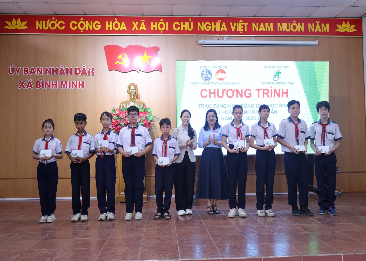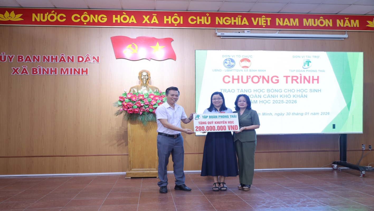 Thay mặt Lãnh đạo địa phương Bà Trần Thị Thanh Phương - Phó Chủ tịch Ủy ban MTTQ xã Bình Minh cảm ơn sự, ghi nhận và bày tỏ tình cảm trân trọng đối với sự quan tâm, chia sẻ đầy nghĩa tình của đơn vị tài trợ- Tập đoàn Phong Thái đã dành cho ngành giáo dục xã nhà, cảm ơn Ban Thường trực UB MTTQ Việt Nam xã, UBND xã là cầu nối giúp đỡ cho các em học sinh có hoàn cảnh khó khăn. Đồng thời mong muốn đơn vị tài trợ - Tập đoàn Phong Thái tiếp tục quan tâm hỗ trợ công tác an sinh xã hội, khuyến học, khuyến tài trên địa bàn xã trong thời gian tới.