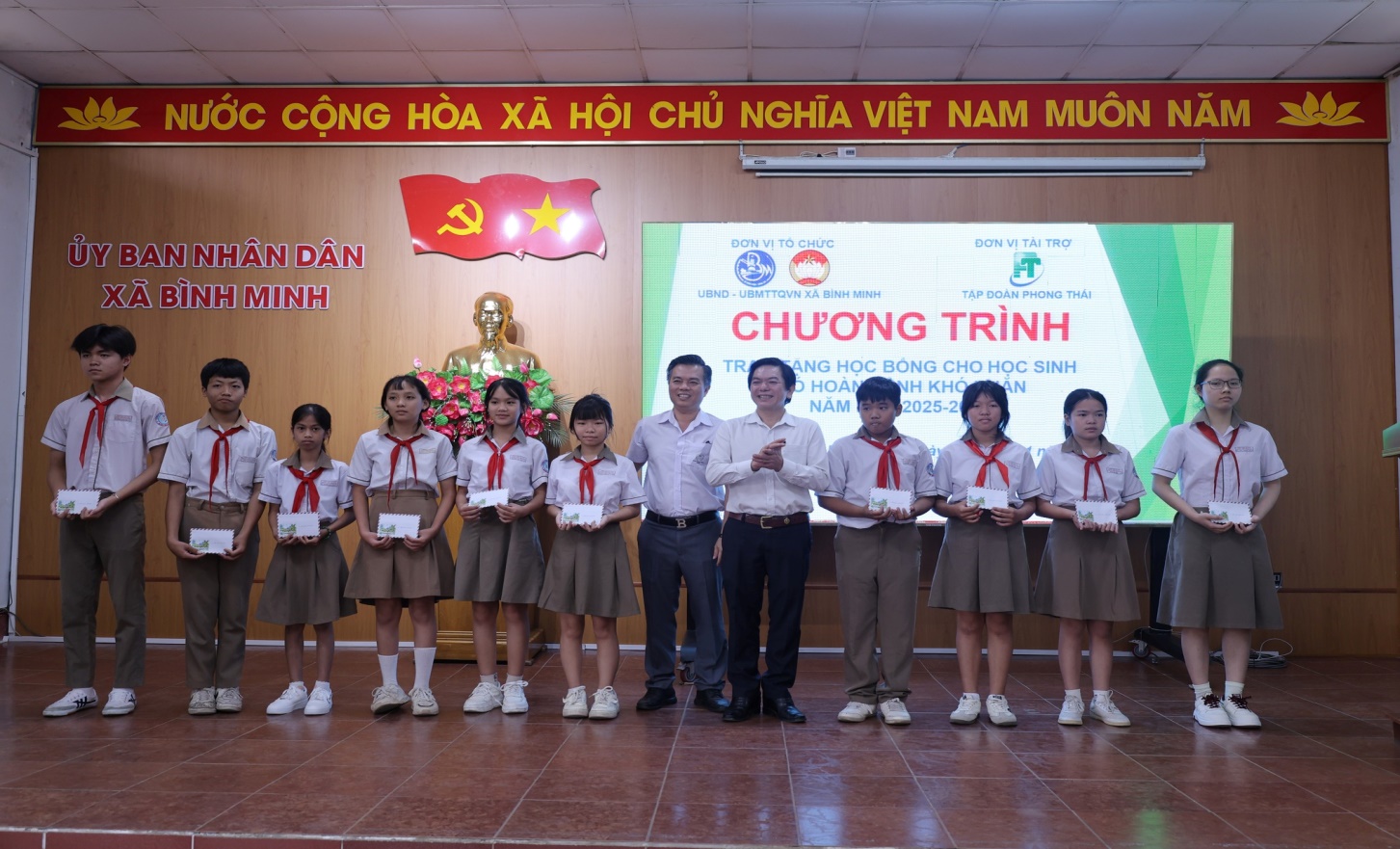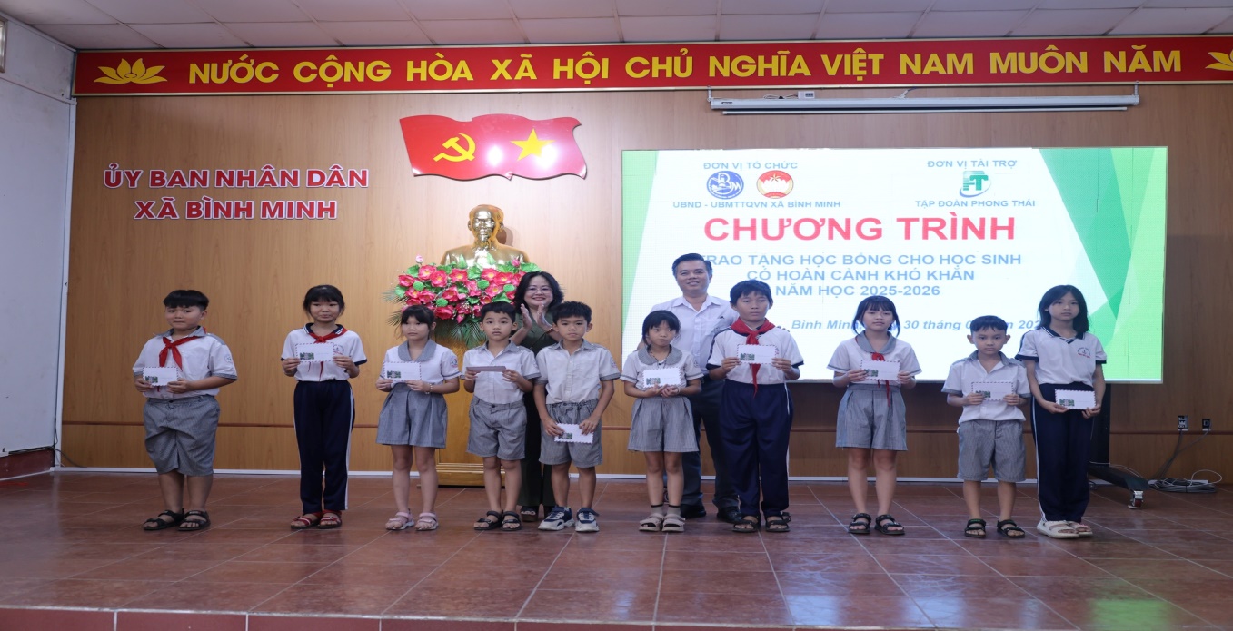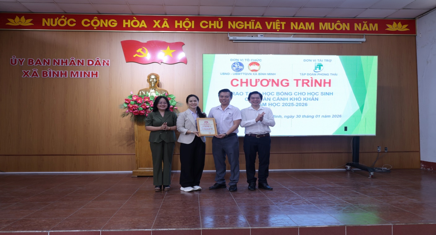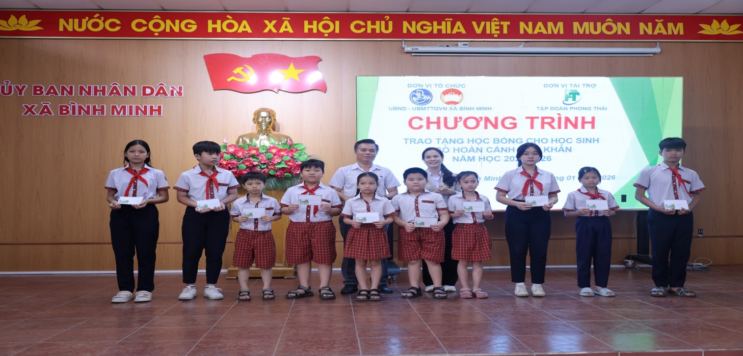 Sáng ngày 30/1/2026, tại hội trường UBND xã Bình Minh. Ban Thường trực UB.MTTQ Việt Nam xã phối hợp với UBND xã Bình Minh và Tập đoàn Phong Thái tổ chức chương trình trao học bổng cho 400 em học sinh có hoàn cảnh khó khăn trên địa bàn xã.