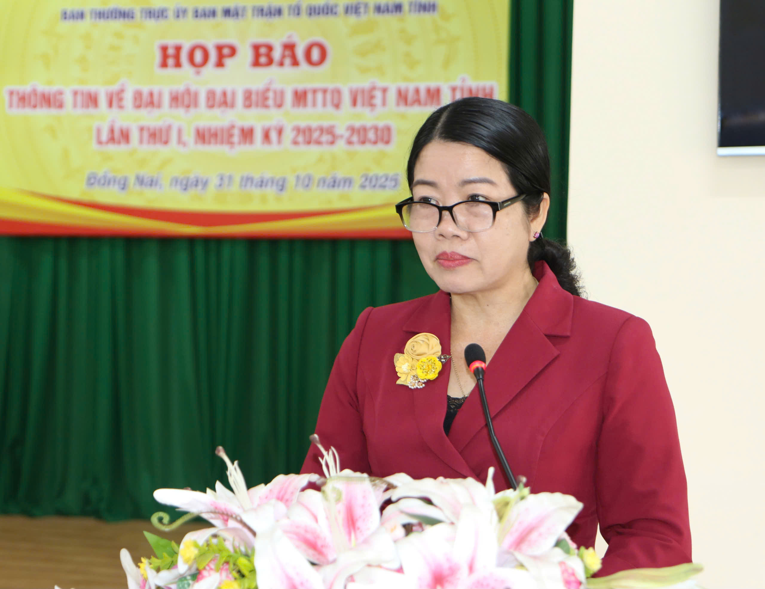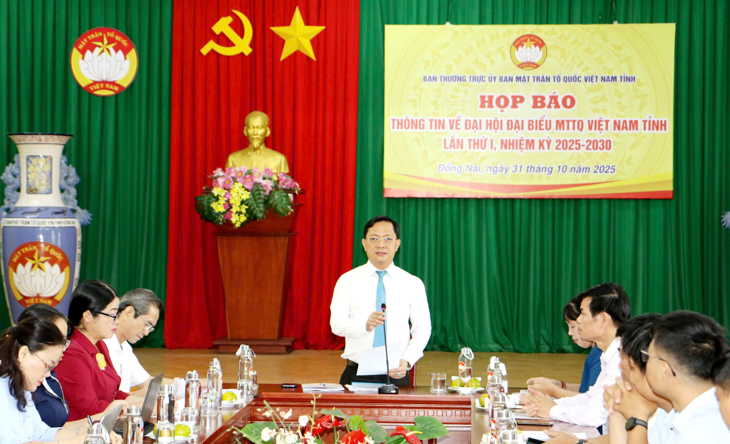 Sáng 31-10, Ban Thường trực Ủy ban MTTQ Việt Nam tỉnh Đồng Nai đã tổ chức Họp báo, chính thức thông tin về Đại hội Đại biểu MTTQ Việt Nam tỉnh lần thứ I, nhiệm kỳ 2025 - 2030. Đây là sự kiện chính trị quan trọng, đánh dấu bước chuyển mình mạnh mẽ trong công tác Mặt trận theo mô hình tổ chức mới.