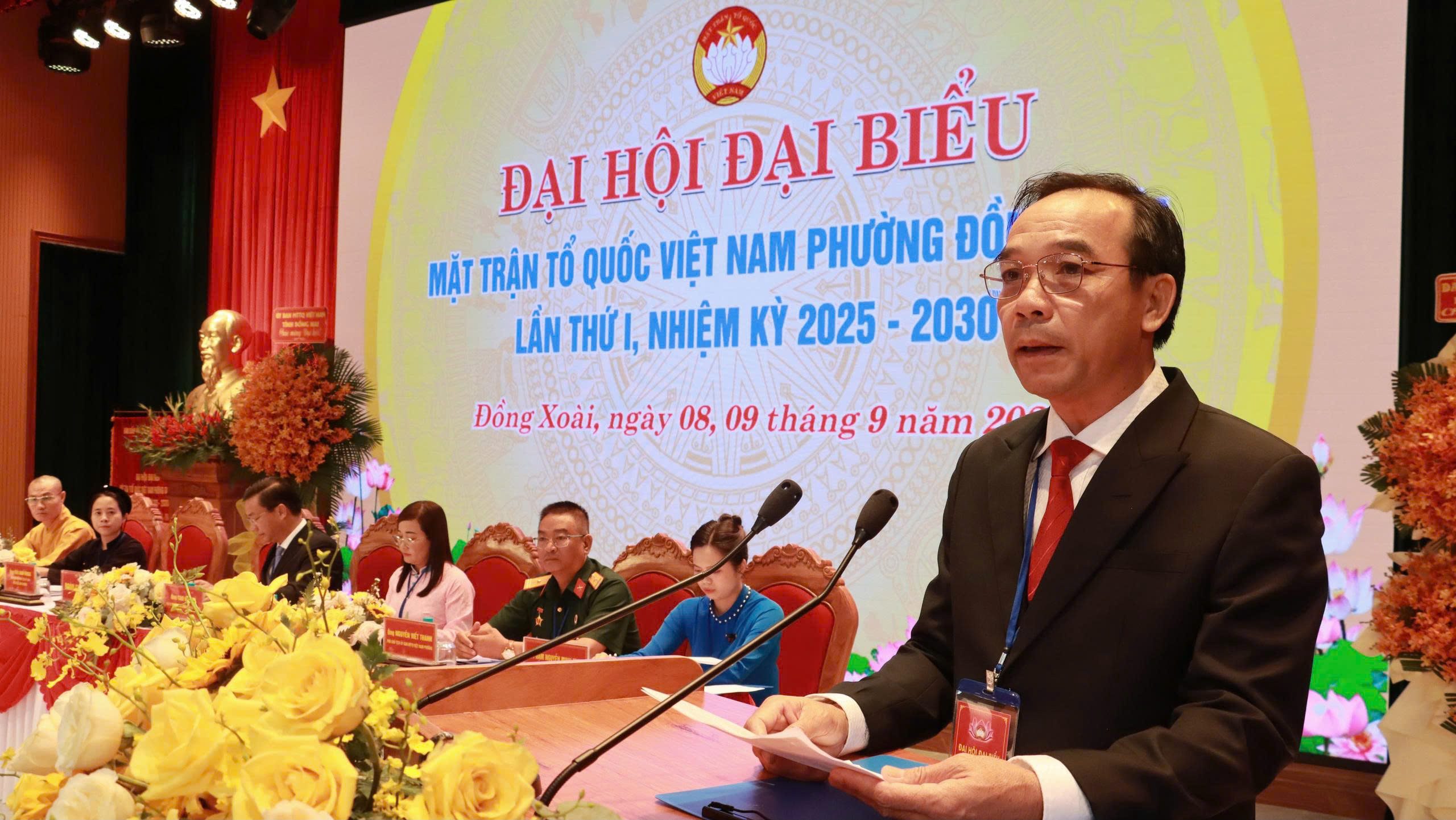 Tạo thế và lực cho công tác Mặt trận trong giai đoạn mớiSáng ngày 9-9, trong không khí thi đua sôi nổi của toàn tỉnh hướng tới kỷ niệm 80 năm Quốc khánh nước Cộng hòa xã hội chủ nghĩa Việt Nam, Đại hội Đại biểu Mặt trận Tổ quốc Việt Nam phường Đồng Xoài lần thứ I, nhiệm kỳ 2025 – 2030 đã long trọng diễn ra. Đây là Đại hội điểm cấp cơ sở do Ban Thường trực Ủy ban MTTQ Việt Nam tỉnh Đồng Nai chỉ đạo, mang ý nghĩa chính trị đặc biệt quan trọng, mở ra bước khởi đầu mới cho công tác Mặt trận toàn tỉnh.