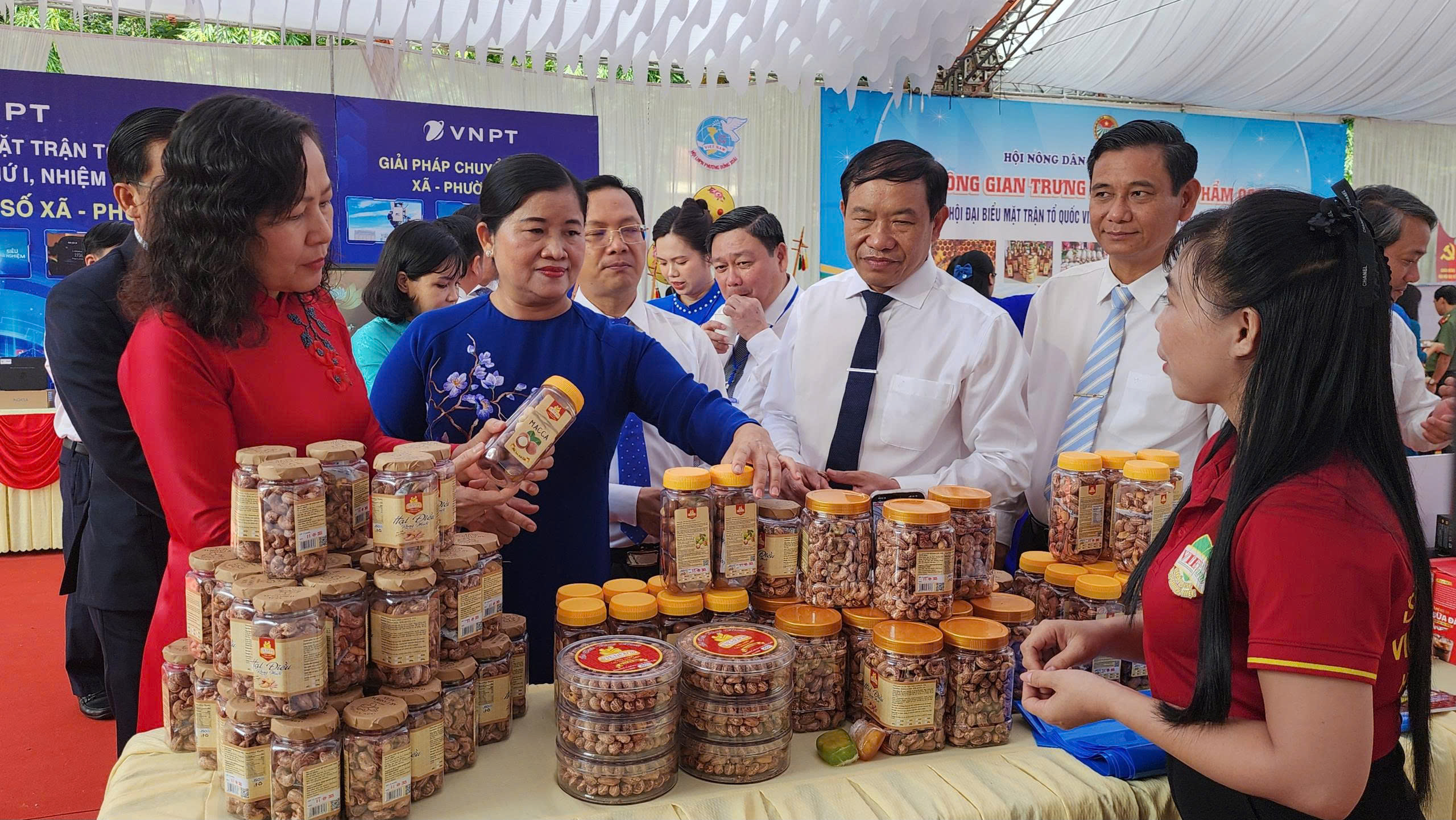 Phó Bí thư Tỉnh ủy, Chủ tịch Ủy ban MTTQ Việt Nam tỉnh Đồng Nai Huỳnh Thị Hằng cùng các đại biểu tham quan gian hàng trưng bày sản phẩm tiêu biểu của phường Đồng Xoài.