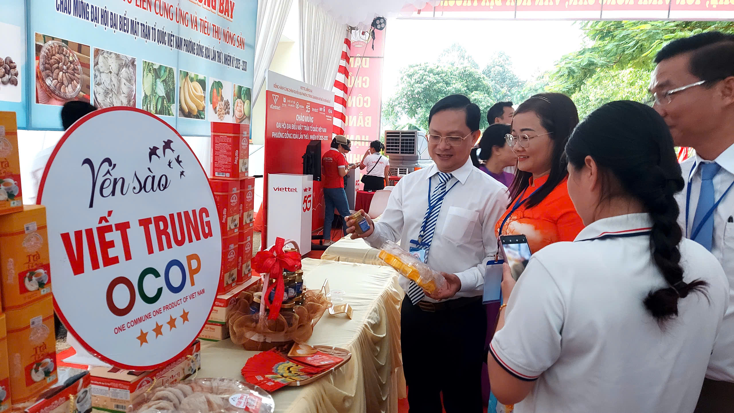 Ủy viên Ban Thường vụ Tỉnh ủy, Phó Chủ tịch Thường trực Ủy ban MTTQ tỉnh Hà Anh Dũng cùng các đại biểu tham quan gian hàng trưng bày sản phẩm tiêu biểu của phường Đồng Xoài.