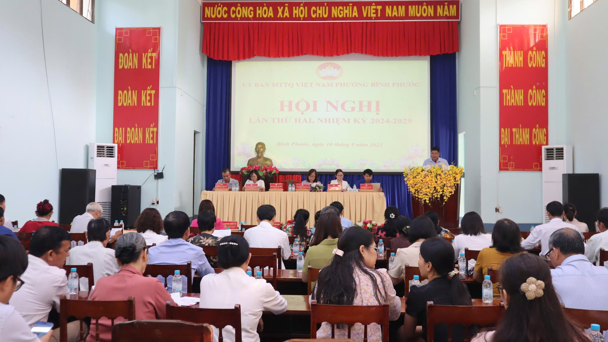 Ngày 10/9/2025, tại Hội trường UBMTTQ Việt Nam phường, UBMTTQ Việt Nam phường Bình Phước tổ chức Hội nghị lần thứ hai Ủy ban MTTQ Việt Nam phường khóa I, nhiệm kỳ 2024 – 2029 để lấy ý kiến đóng góp vào dự thảo văn kiện trình Đại hội đại biểu MTTQ Việt Nam phường, nhiệm kỳ 2025 – 2030.