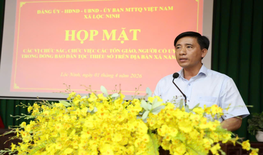 Sáng ngày 01/4/2026, Đảng ủy - Hội đồng nhân dân - Ủy ban nhân dân - Ủy ban MTTQ Việt Nam xã Lộc Ninh tổ chức Họp mặt các vị chức sắc, chức việc các tôn giáo và người có uy tín trong đồng bào dân tộc thiểu số trên địa bàn xã năm 2026.