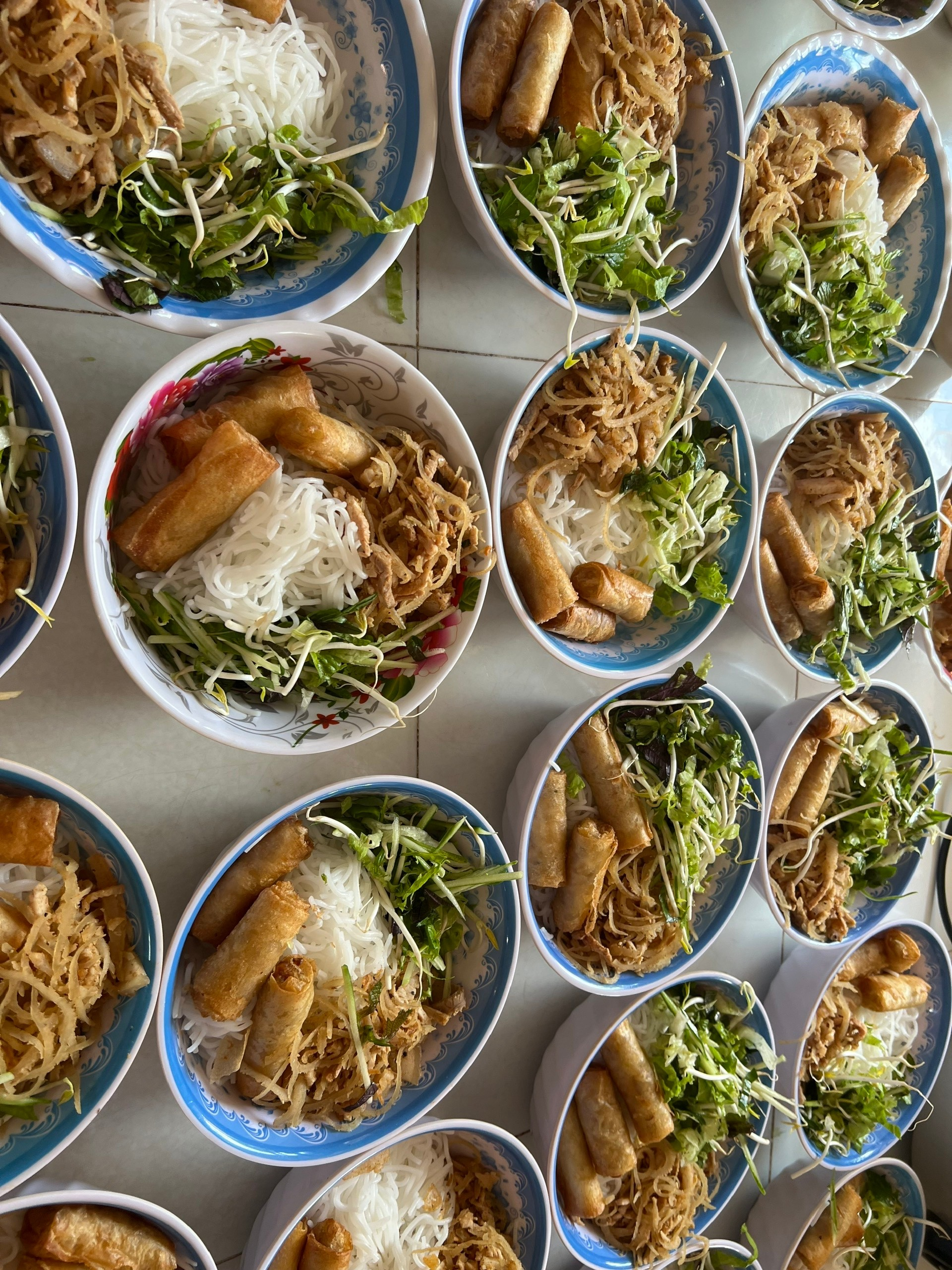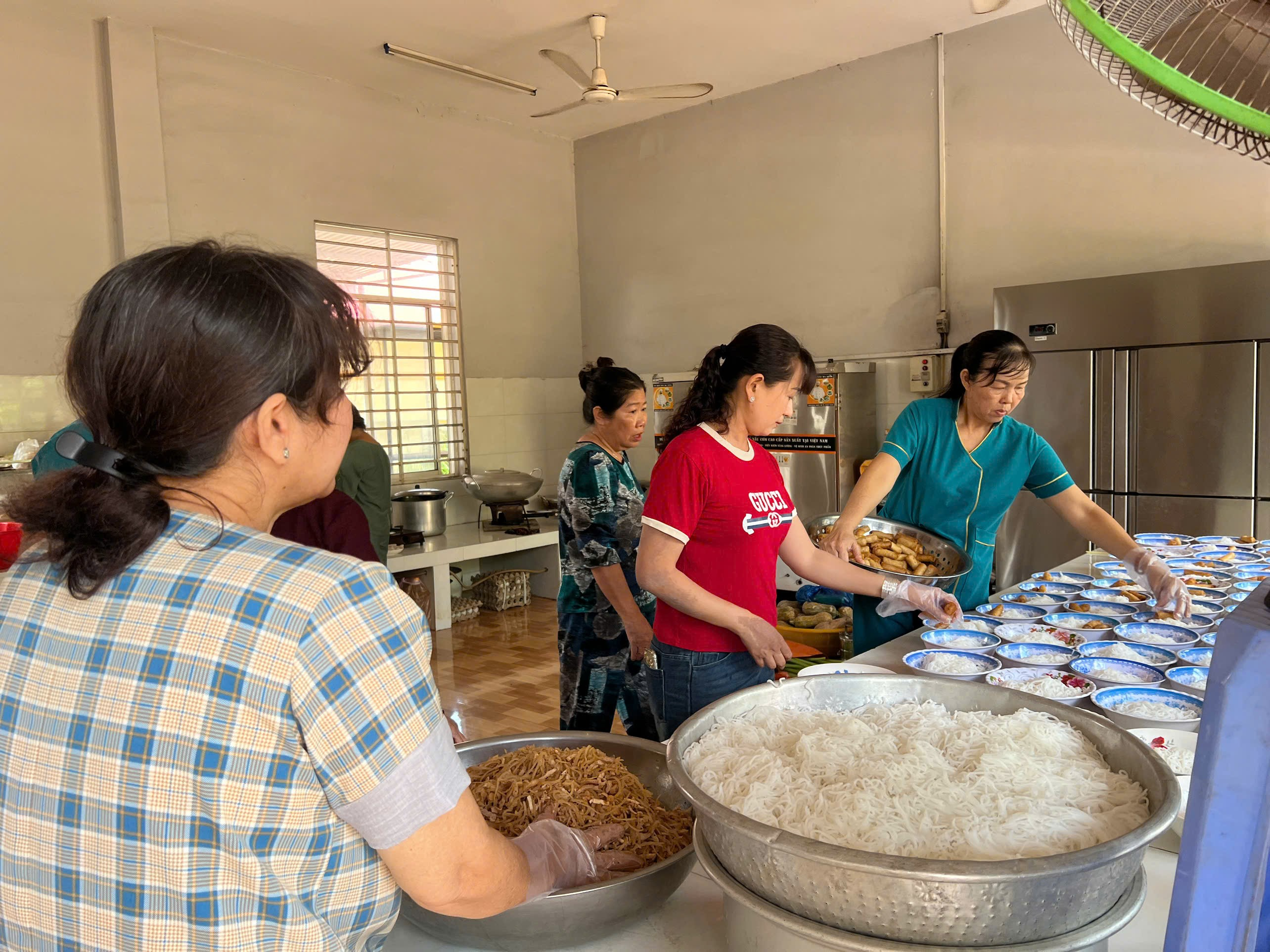 Thành viên Bếp ăn Thiện nguyện Hương Tiên đang chuẩn bị món bún bì, chả giò