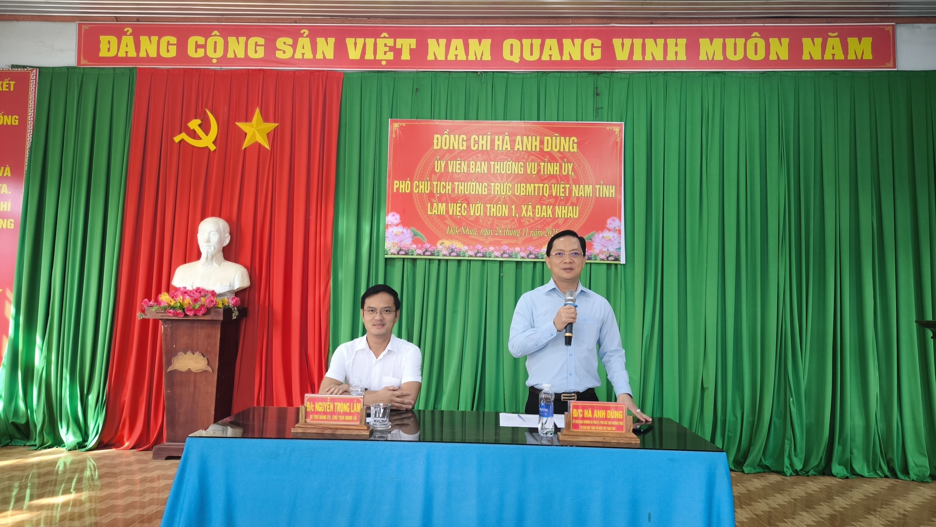 Sau khi lắng nghe và khảo sát thực tế tiến độ xây dựng trụ sở Đảng ủy - UBND xã, đồng chí Hà Anh Dũng đã đưa ra những chỉ đạo mang tính định hướng chiến lược để tháo gỡ khó khăn cho Đak Nhau. Về nhiệm vụ trước mắt, đồng chí yêu cầu địa phương phải tập trung cao độ cho công tác giải ngân vốn đầu tư công, đảm bảo đạt yêu cầu đề ra. Đối với các chương trình, dự án phát triển, không được làm manh mún mà phải đầu tư đồng bộ. "Để làm được điều này, vai trò giám sát của Hội đồng nhân dân và Mặt trận Tổ quốc Việt Nam xã là cực kỳ quan trọng. Hai cơ quan này phải cùng tham gia giám sát ngay từ đầu để đảm bảo mỗi đồng vốn bỏ ra đều mang lại hiệu quả thực tế cho dân" – đồng chí Hà Anh Dũng nhấn mạnh.