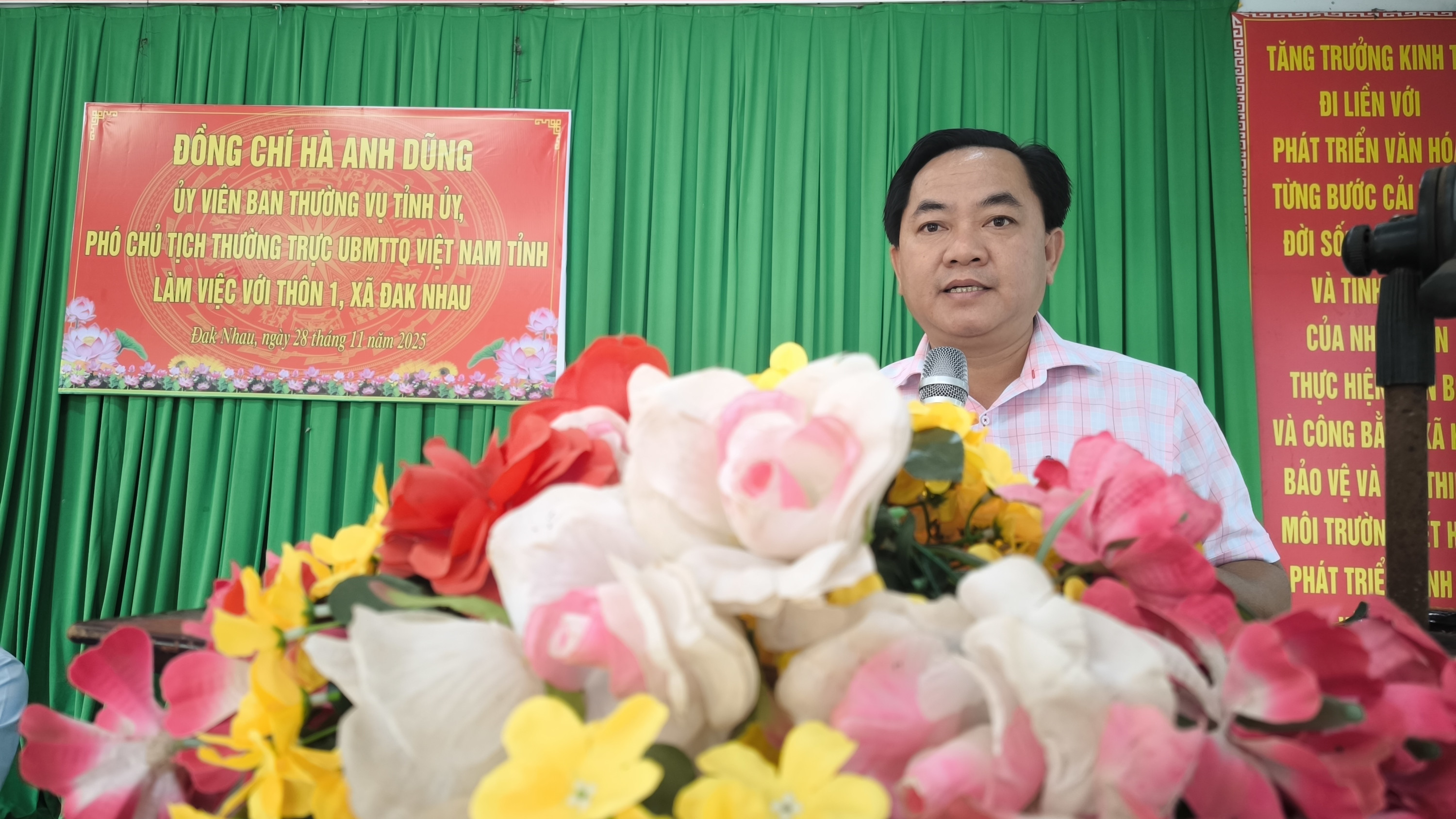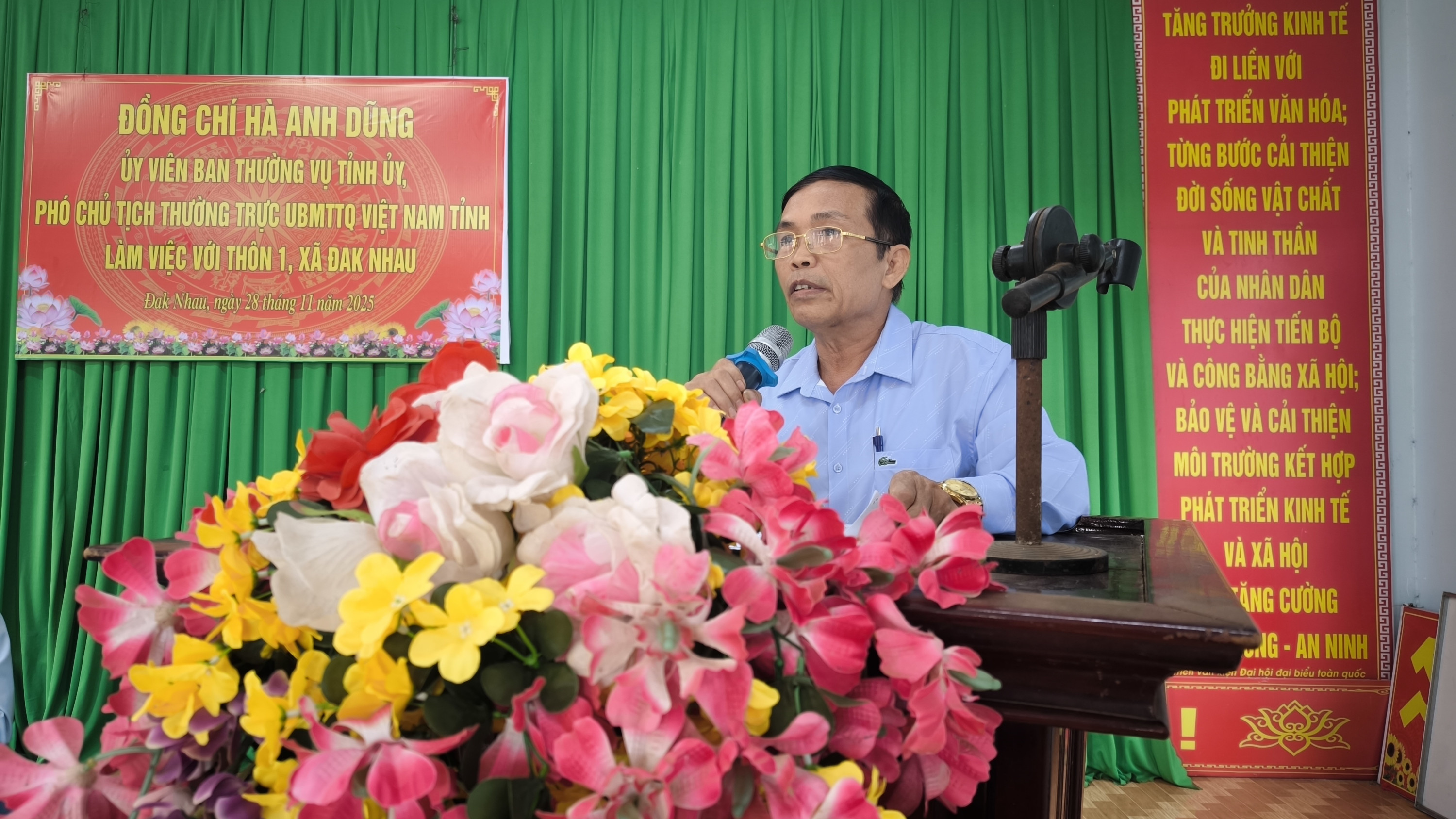 Với phương châm "Hướng về cơ sở" tại buổi làm việc nhiều vấn đề cốt lõi từ bài toán giảm nghèo, chuyển đổi số đến kiện toàn nhân sự đã được đưa ra bàn thảo nhằm tìm lời giải cho địa bàn cửa ngõ chiến lược này. Thực hiện chủ trương sắp xếp đơn vị hành chính, từ ngày 01/7/2025, Đảng bộ xã Đak Nhau chính thức hoạt động trên cơ sở sáp nhập nguyên trạng với xã Đường 10. Đây là bước ngoặt mở ra không gian phát triển mới nhưng cũng đặt ra những thách thức không nhỏ cho bộ máy vừa được "làm mới". Đoàn công tác đã dành nhiều thời gian lắng nghe "hơi thở" từ cơ sở tại buổi làm việc với Chi bộ Thôn 1. Bên cạnh việc ghi nhận tinh thần đoàn kết, phấn đấu vượt khó của Chi bộ, đồng chí Hà Anh Dũng đặc biệt lưu ý đến công tác giảm nghèo bền vững và tập hợp thanh niên tại địa phương.
