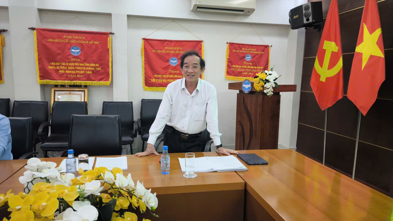 đồng chí Bí thư Liên hiệp các tổ chức hữu nghị tỉnh Nguyễn Thành Trí trình bày báo cáo vai trò của người đứng đầu